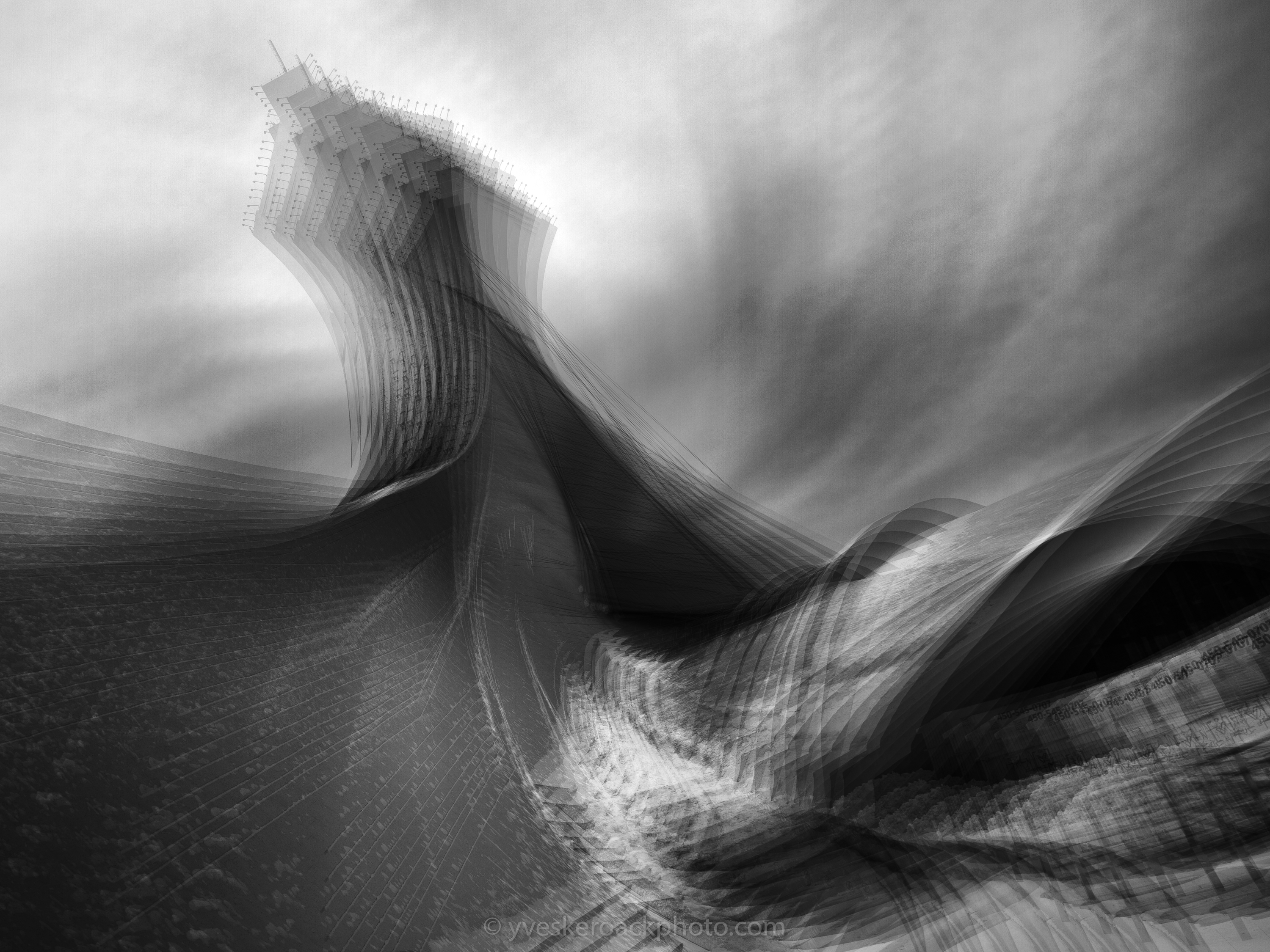 Photo du stade olympique de Montréal réalisée par mouvement intentionnel de l’appareil photo (ICM – Intentional Camera Movement), superposition de 9 images dans l’appareil, post-traitement dans Lightroom.