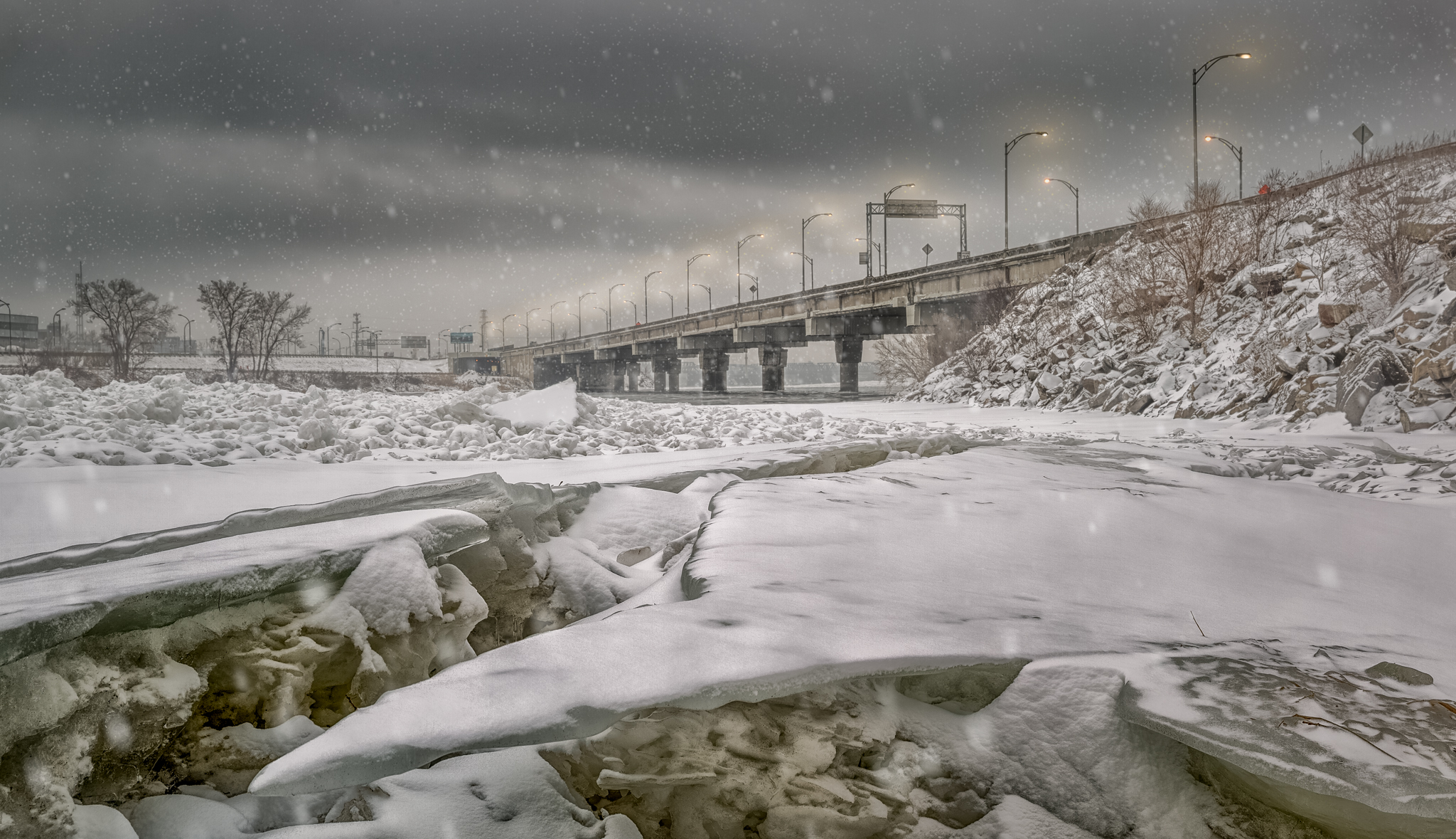 Formations de glace sur le fleuve devant le pont Clément
